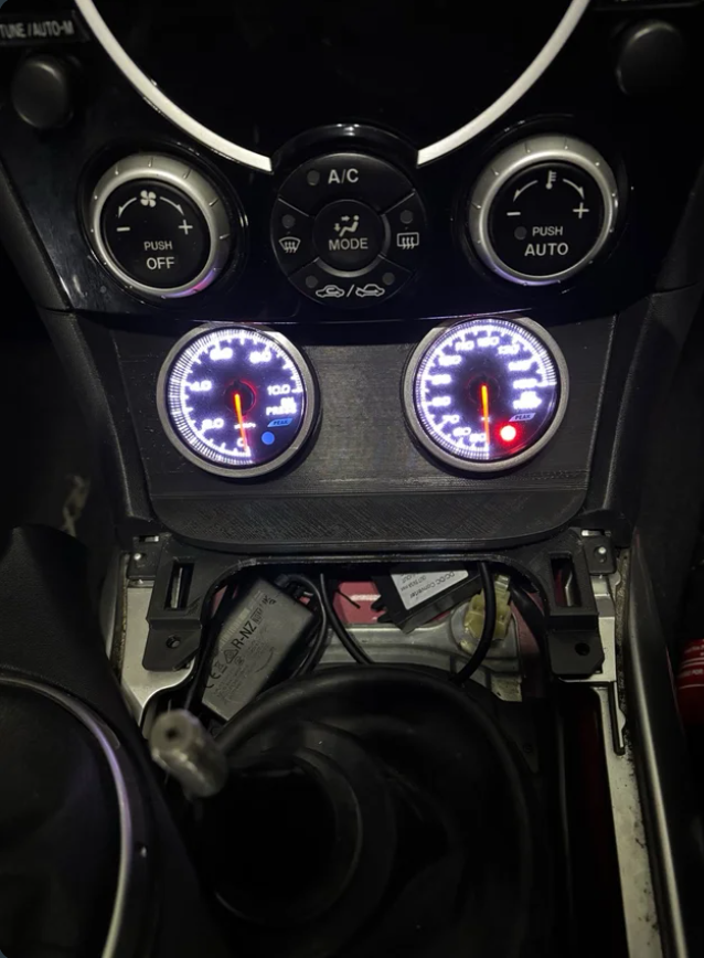 Este panel permite instalar manómetros de 52mm o 56mm, ideal para controlar parámetros como presión de aceite, temperatura o turbo, manteniendo una estética limpia y totalmente integrada.